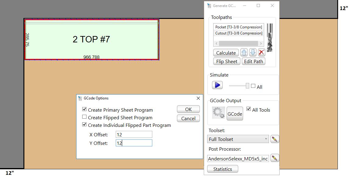 In the Optimizer, place the part with a flipside operation on your sheet, check "Create Individual Flipped Part Program" when generating your GCode, and use an offset X & Y of 12. Then physically place the flipped part on your board against the L shaped material. Keep in mind, the gray part is NOT going to be in the optimizer. It is physically on your board, and the optimizer will calculate it using the X/Y Offset.