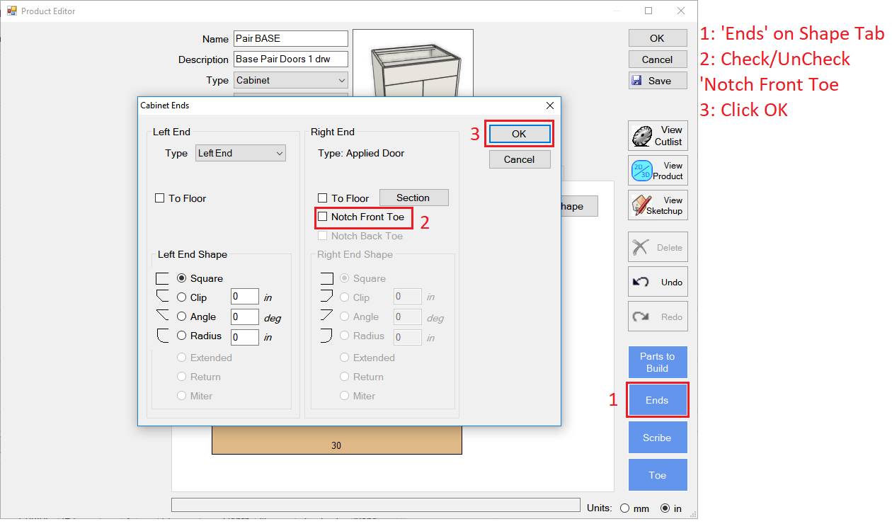 - Navigate to the Shape Tab within the Product Editor. Please refer to the graphic below for instructions on how to remove the toe notch from your applied doors.