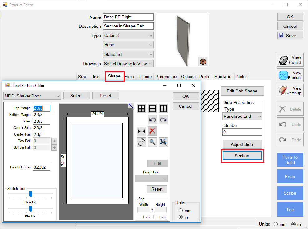 These products can be added and edited similarly to any other cabinet. By accessing the Shape tab, the parts can be sectioned in the same manner as any other door.