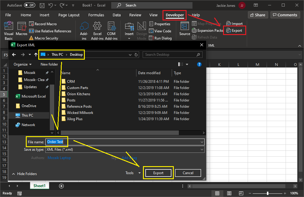 - Click 'Export' and choose the location & file name for the order-Export