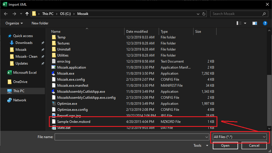 - Select Import, change the file type from XML to All Files & select the Sample Order.mzkord from C:/Mozaik