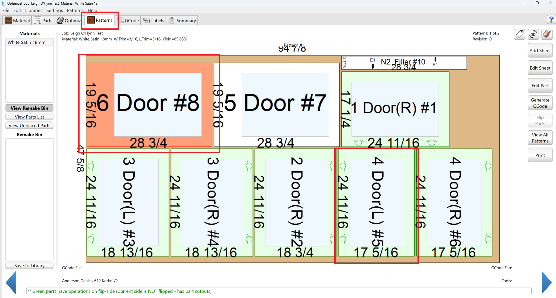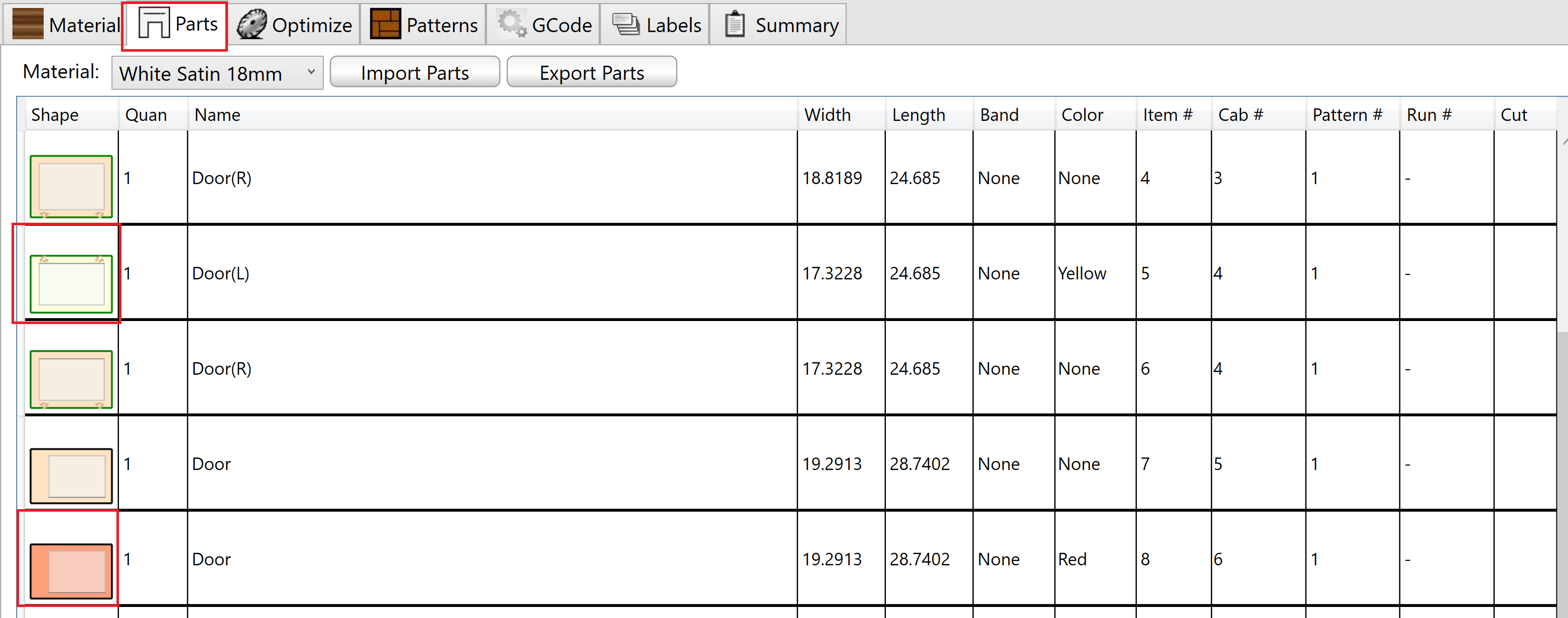 Once you send the parts to the optimizer, you will then see the color both in the Parts tab of the Optimizer as well as the Patterns tab: