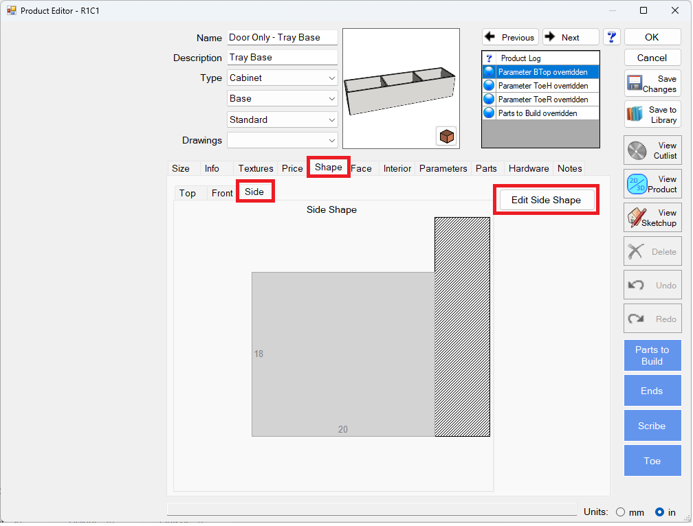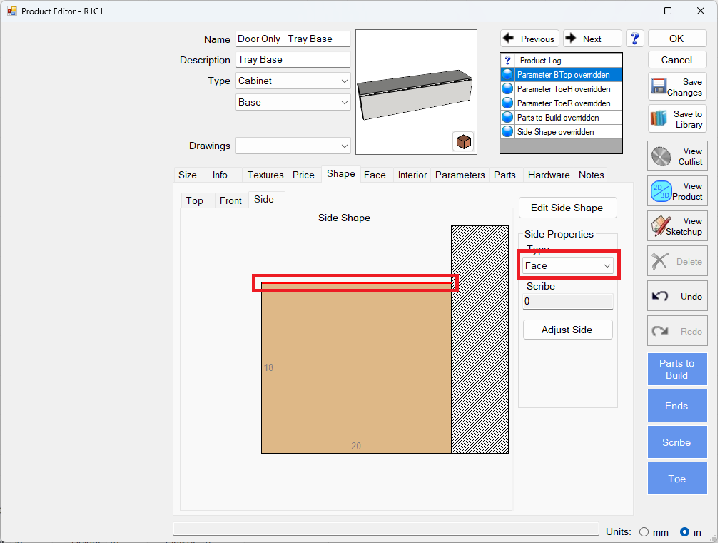 In order to create a hinged top style bench, you will need to reassign the Sides in the Side tab so that you can make the top into a face, and door (and hinge operations) can be added. You will want to go into the Product Editor, select the Shape tab, and then choose the Side tab. You will click Edit Side Shape, and click Yes to confirming that top or front shaping information will be lost.