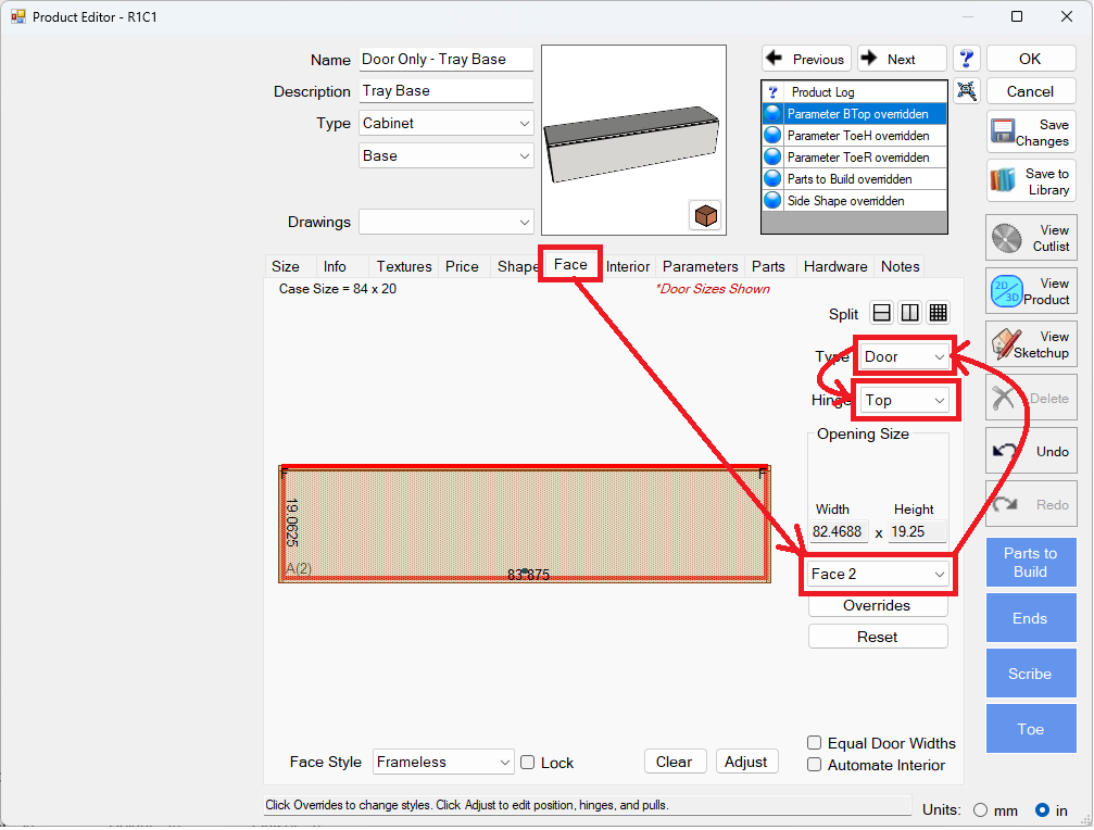 Click on the Face tab, select the new Face (Face 2 in this case). You can add a door, and change the hinge to top.