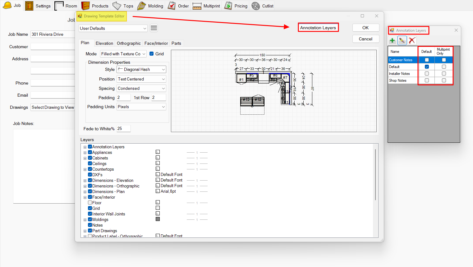 Drawing Templates control how dimensions and annotations are displayed between the Product tab and MultiPrint.