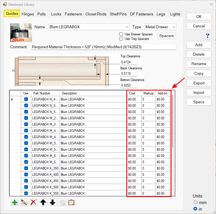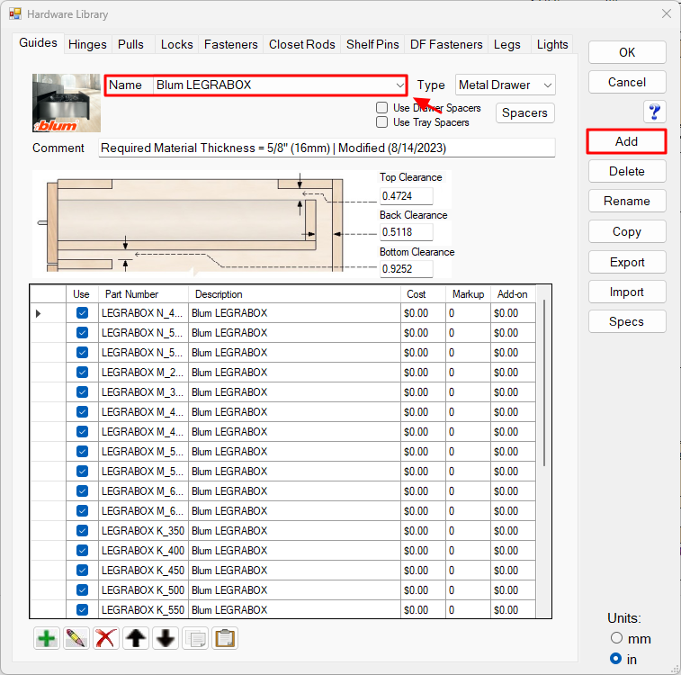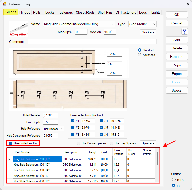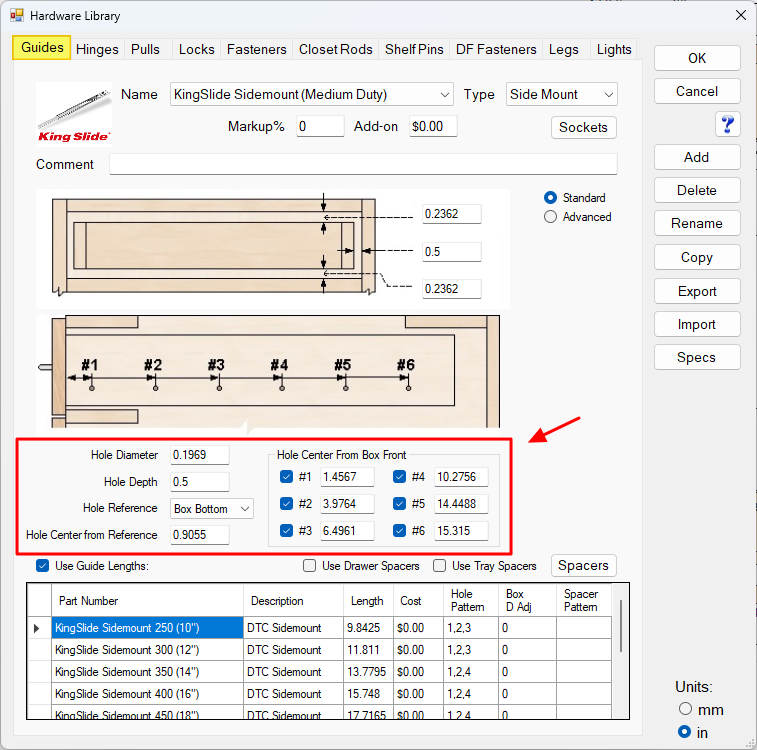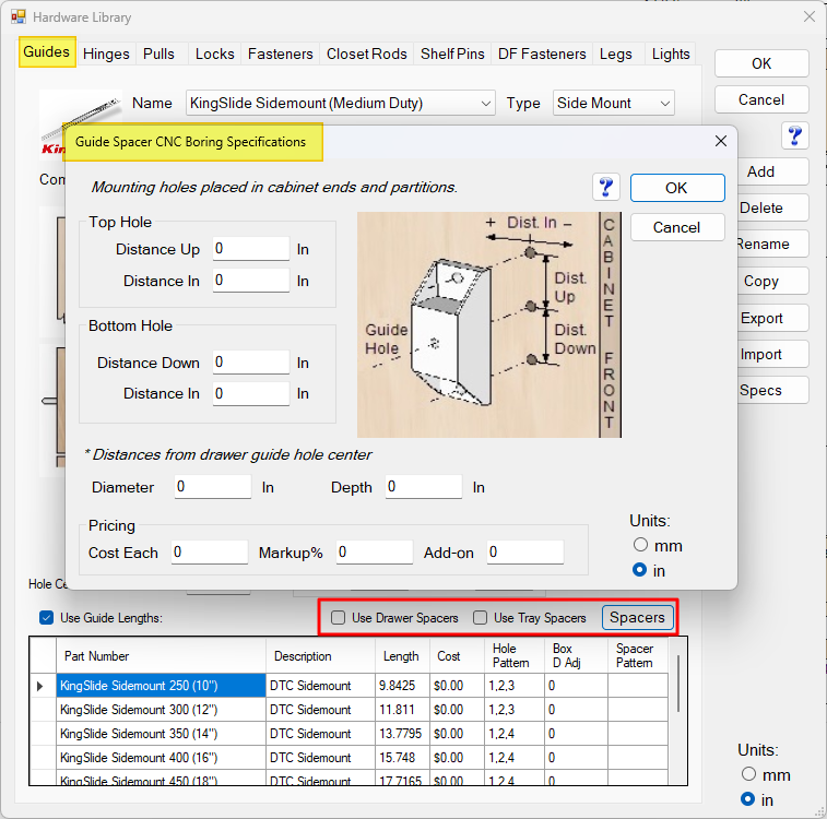 This guide explains how drawer guides (slides) are configured in Mozaik and how those settings are used to automatically size and apply drawer boxes. Drawer guide configuration is handled through the Hardware Library → Guides Tab and directly affects drawer box width, depth, clearances, boring, and hardware selection.