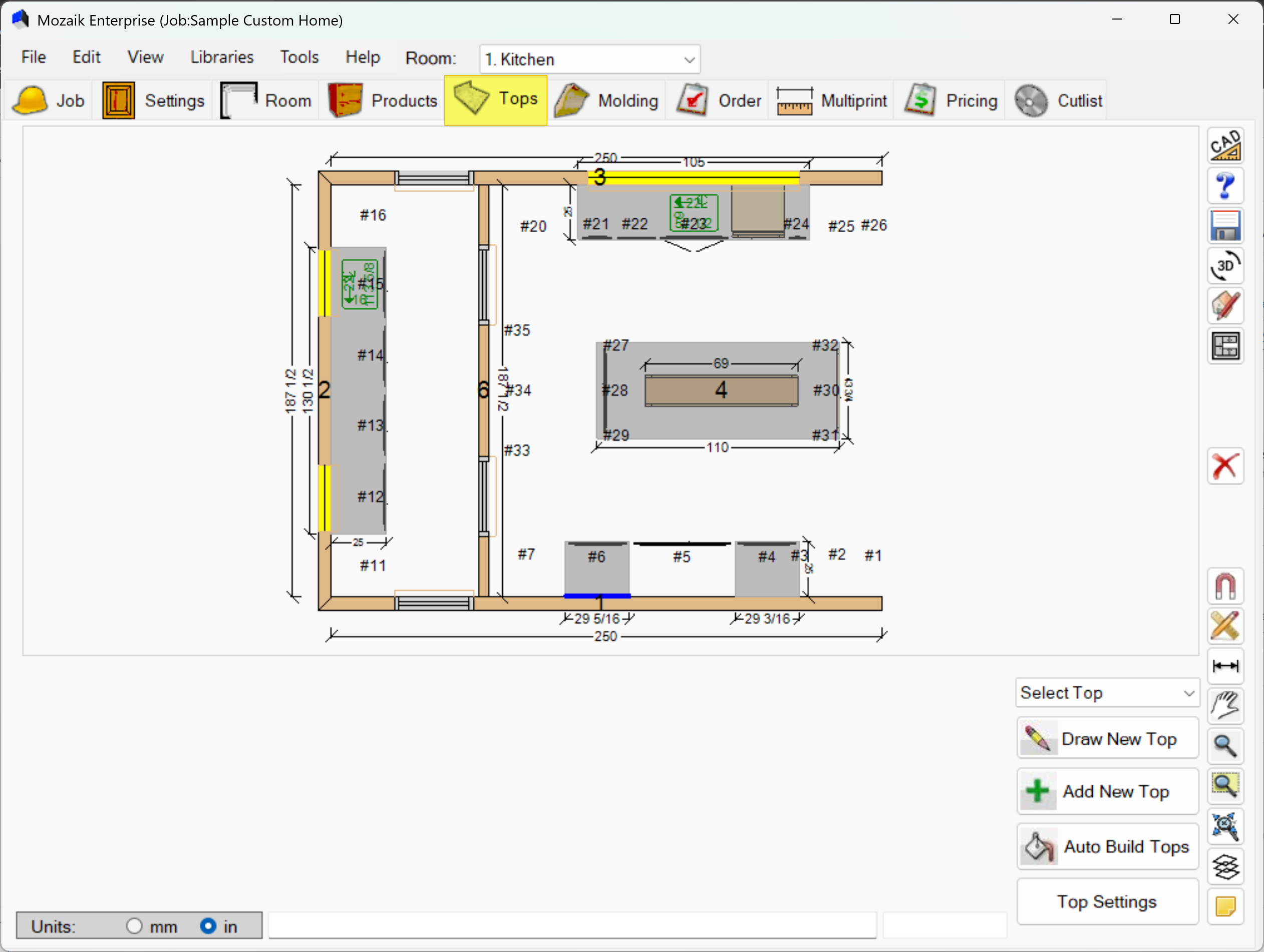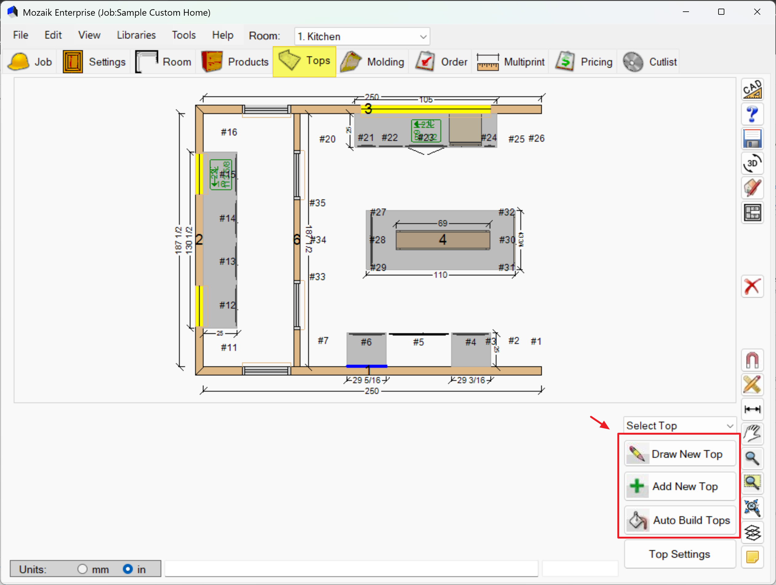 Click Auto Build Tops to let Mozaik automatically generate countertops for all cabinets in your design. This is the fastest method for standard layouts.