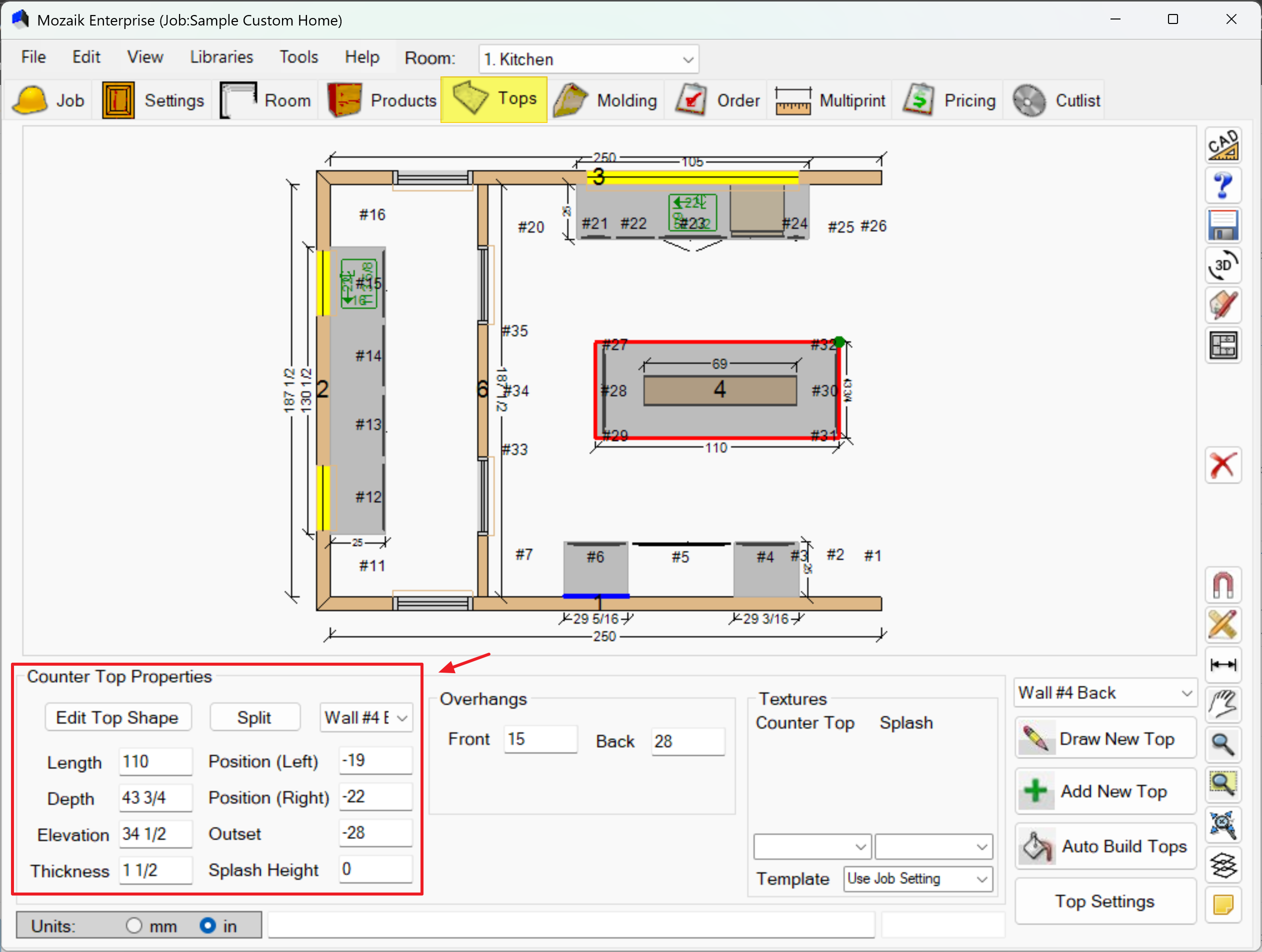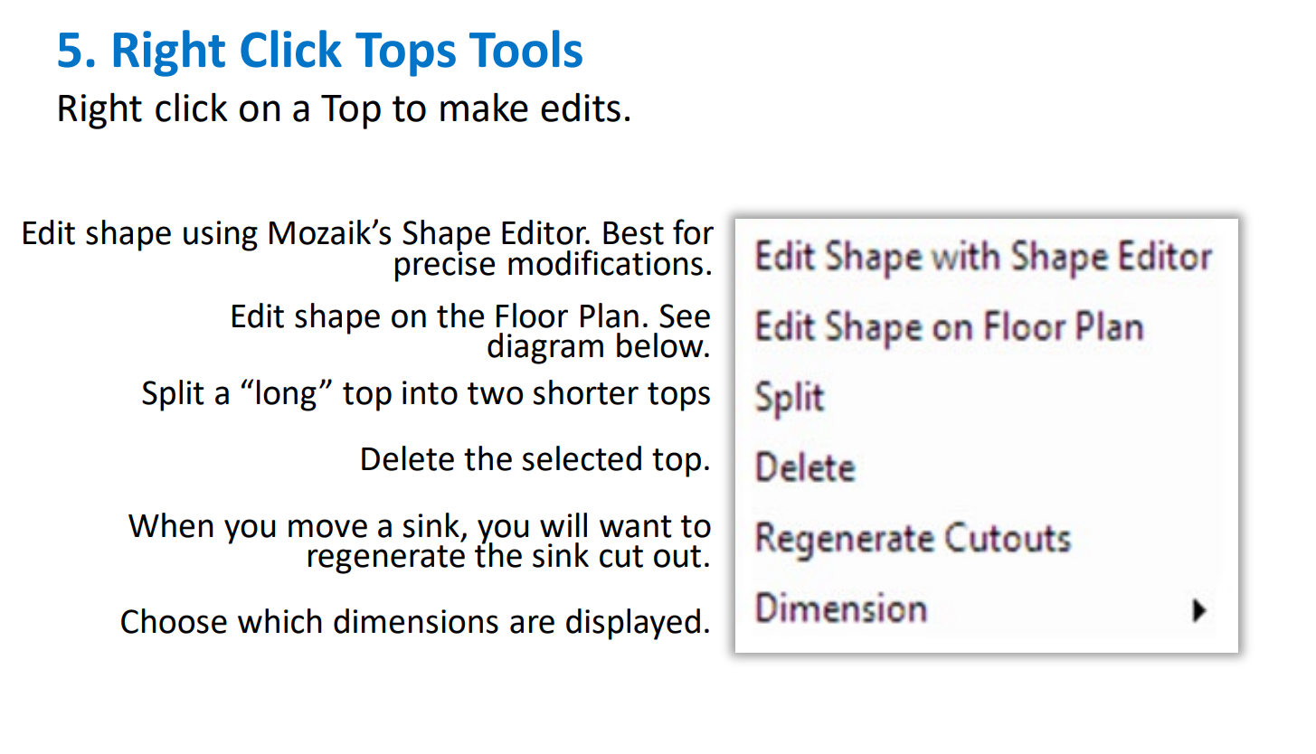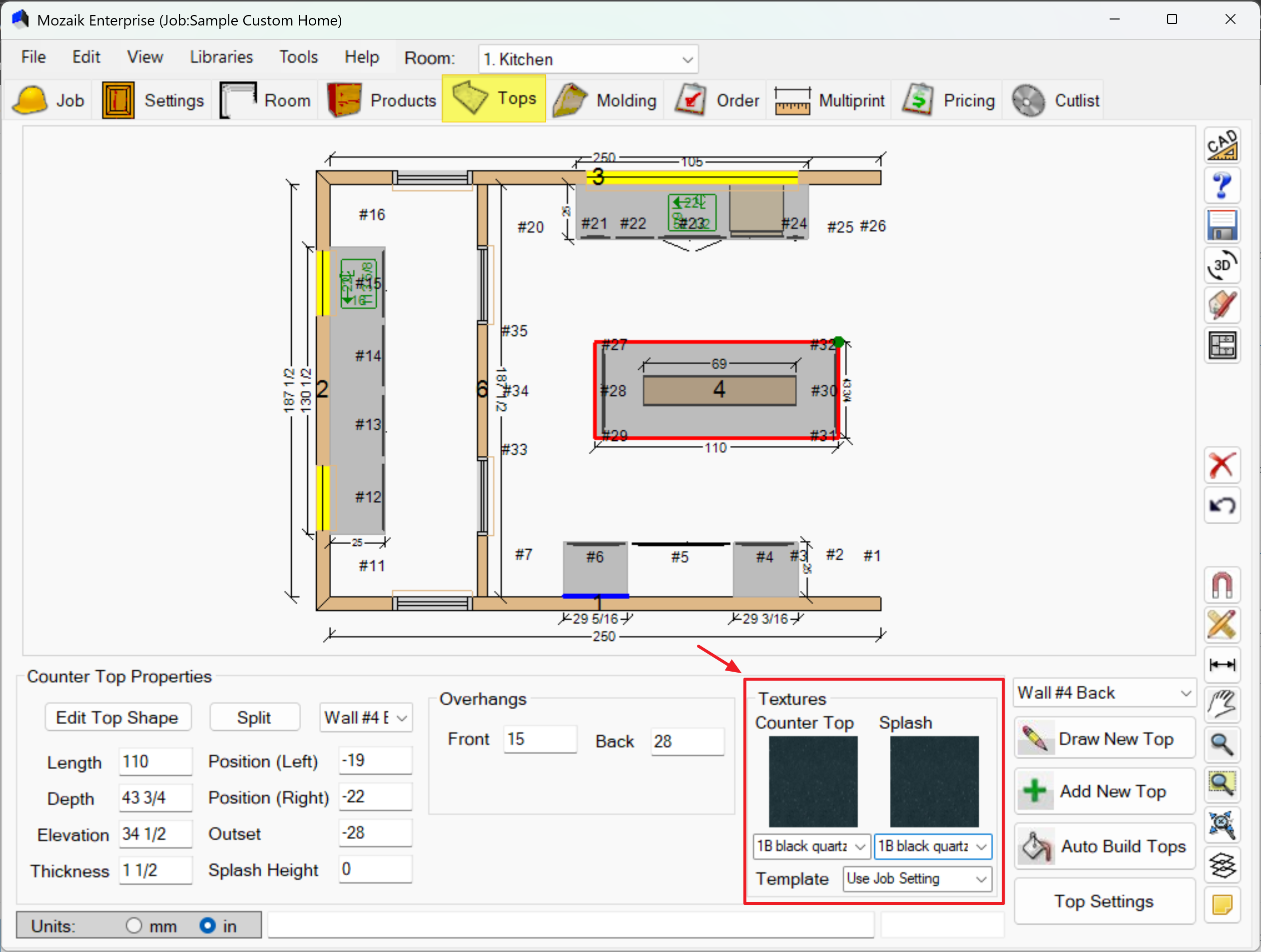 The Tops Tab in Mozaik is your workspace for adding, editing, and customizing countertops in your cabinet designs. This guide will walk you through the main features and tools available.