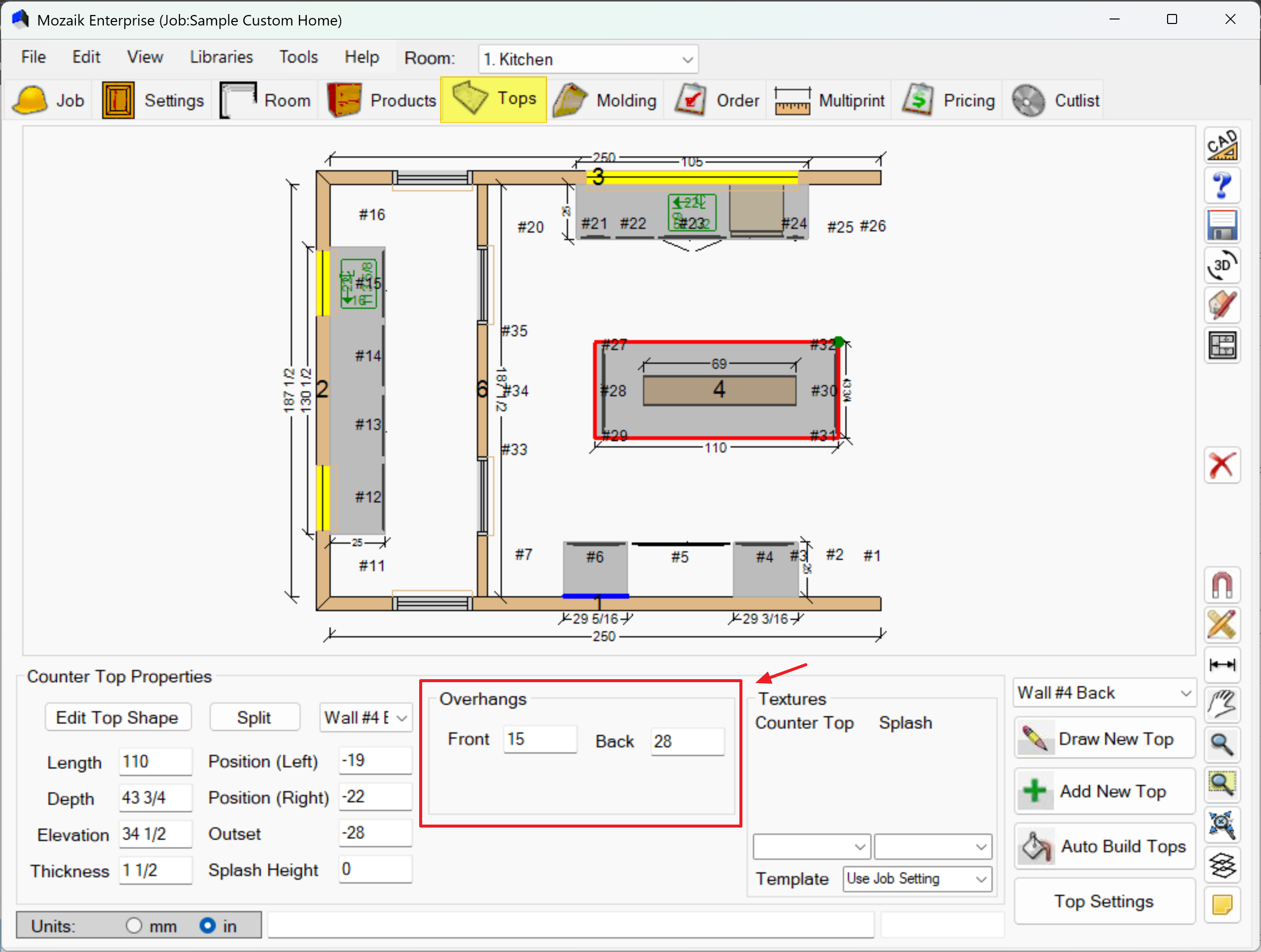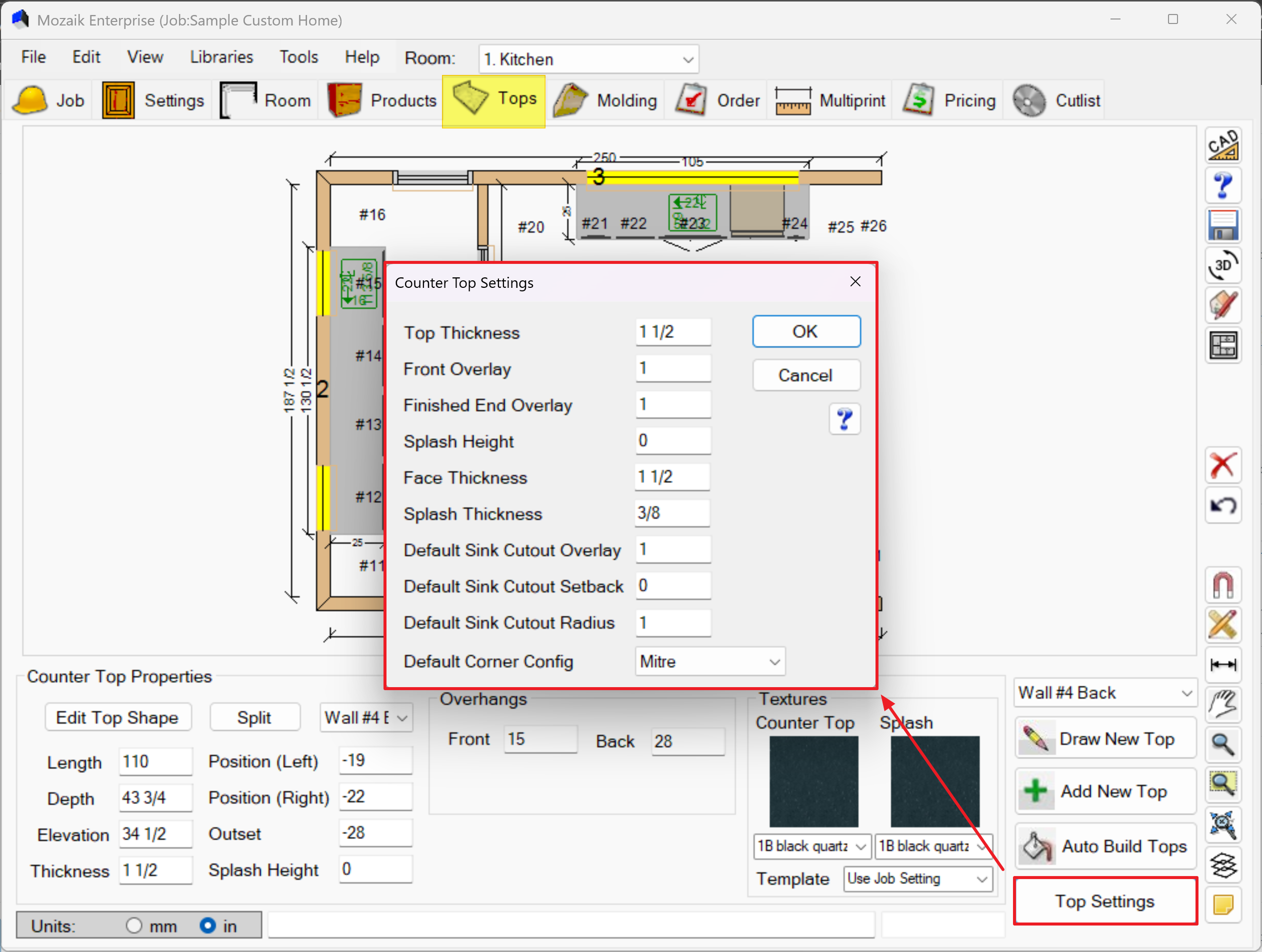 Click Top Settings to set default values for all new countertops: