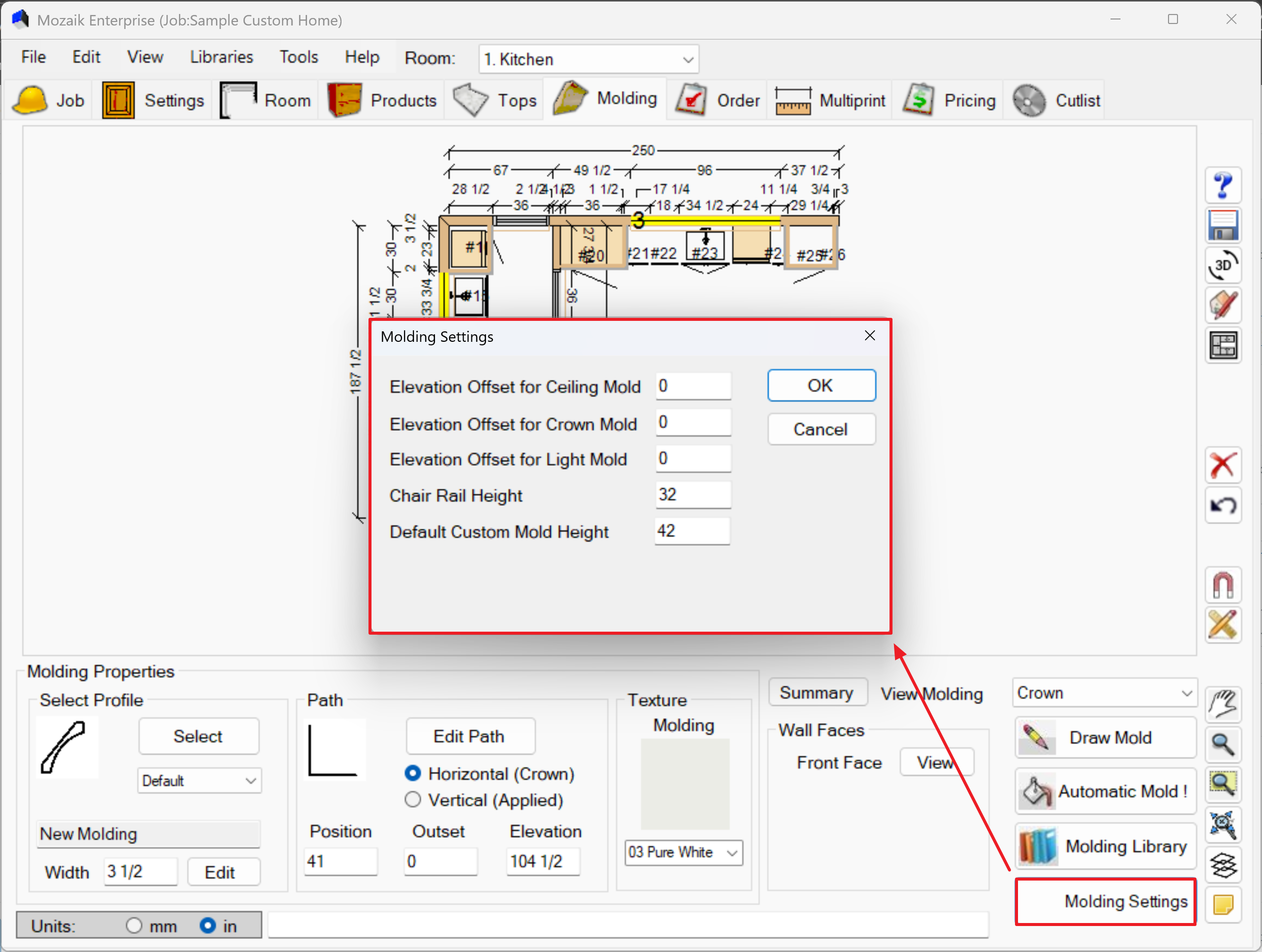 - If molding doesn't appear where expected, check the elevation settings in Molding Settings
