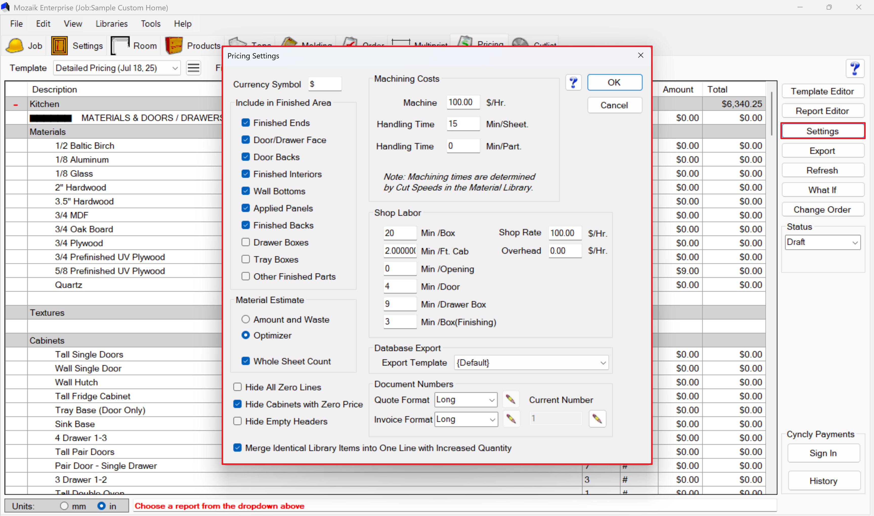 Click Settings to access the Pricing Settings menu where you configure how Mozaik calculates costs: