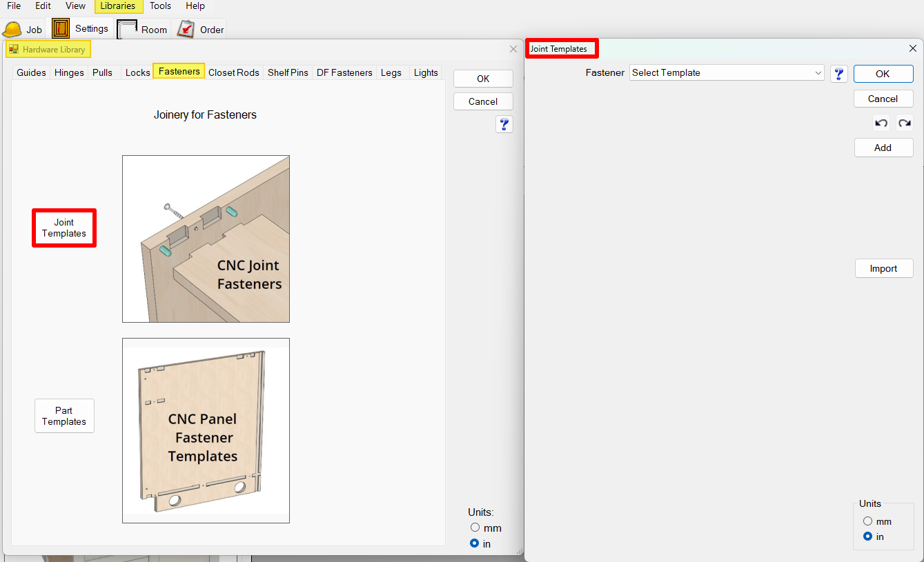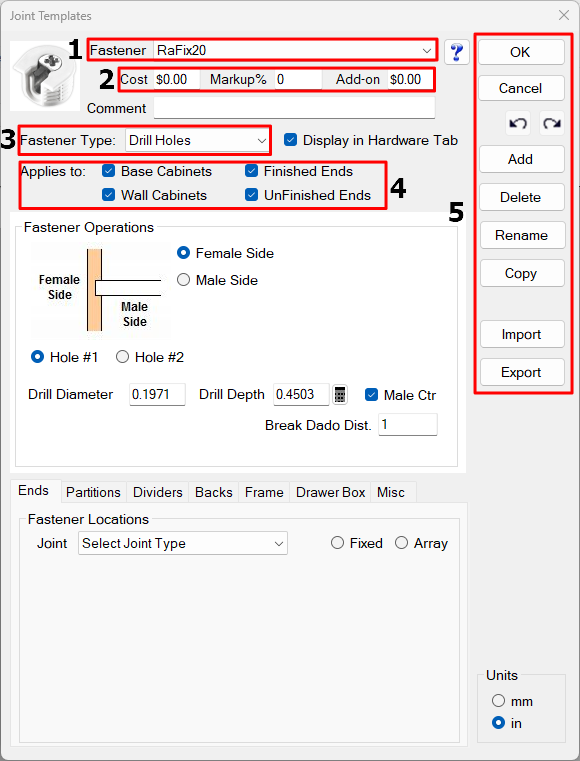 Joint Templates define the operations needed at cabinet joints for different fastening systems. Instead of manually adding holes or routes to each joint, you create a template once and Mozaik automatically applies it to all appropriate joints in your cabinets.