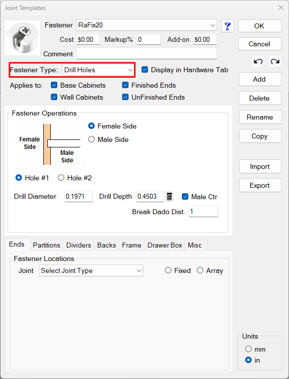 Joint Templates (also called Joint Fasteners) allow you to add drilling and routing operations to cabinet joints to accommodate various fastening systems. This powerful feature automates the placement of Confirmats, dowels, biscuits, pocket screws, and other connector systems throughout your cabinets.