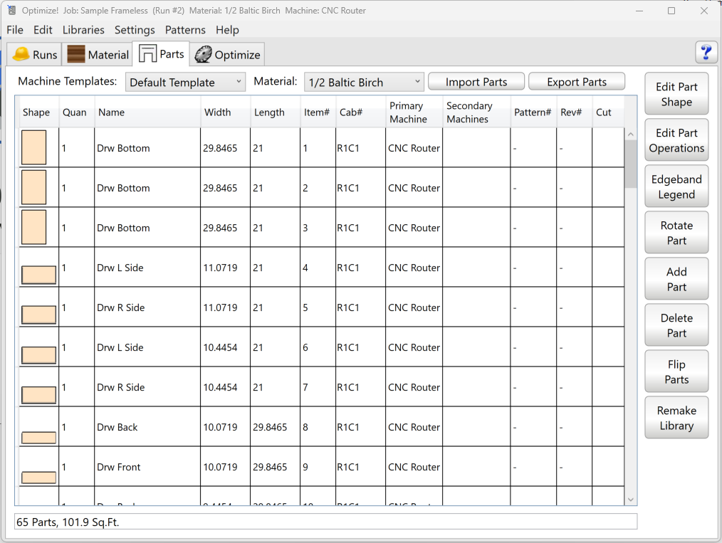 The bar at the bottom of the parts list shows a summary of the total part count and total square footage for the selected material. Use this as a quick sanity check before running the Optimizer.