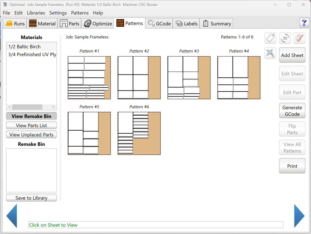 - View Remake Bin — Shows parts flagged for recutting. See the Remake Bin section below.