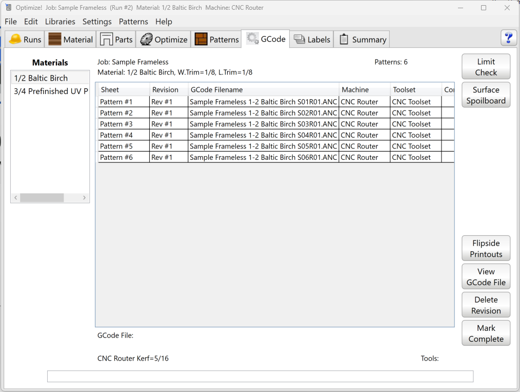 Click a material in the Materials list on the left to display its G-Code files. The file list shows each pattern, its run number, G-Code filename, machine, toolset, and whether it has been marked complete.
