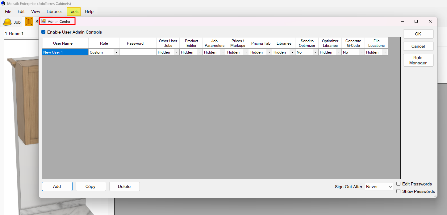 User Admin Controls is a feature exclusive to Mozaik Enterprise that allows administrators to create user accounts and manage their access permissions across different areas of the software. This feature enables shops to control who can access specific functions, helping maintain security, prevent accidental changes, and customize the software experience for different roles.: