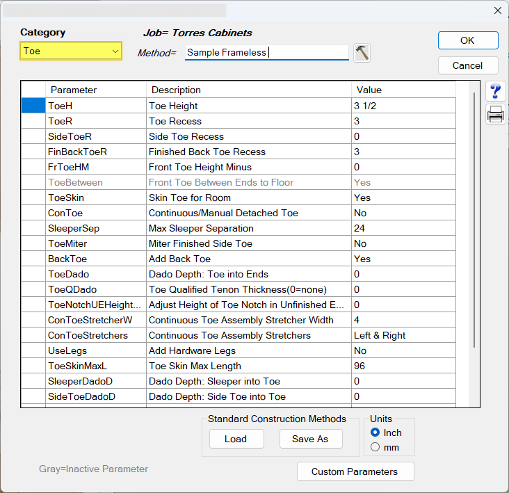 ConToe and other toe parameters: When ConToe is set to YES, most integrated toe parameters are ignored because toe parts are removed from individual cabinets. Only ConToeStretchers, ConToeStretcherW, and SleeperSep affect the detached assembly.
