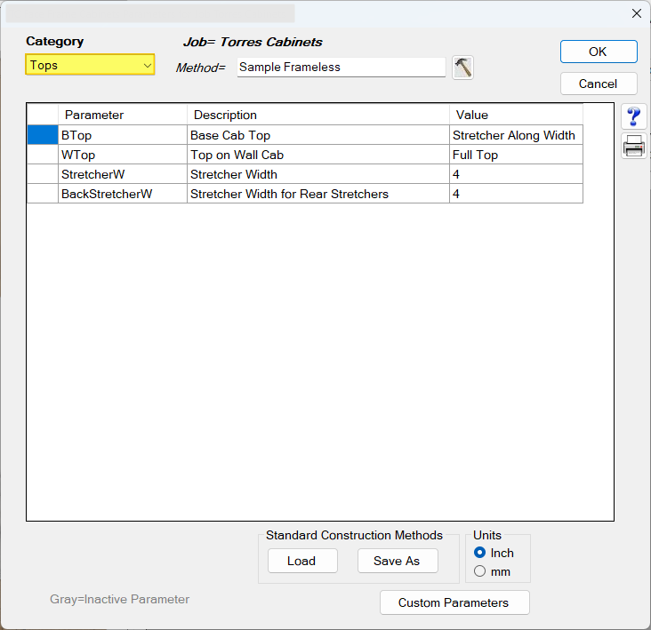 | WTop | Wall & Tall cabinets | Top type (Full, Stretcher Width, Stretcher Depth, None) |