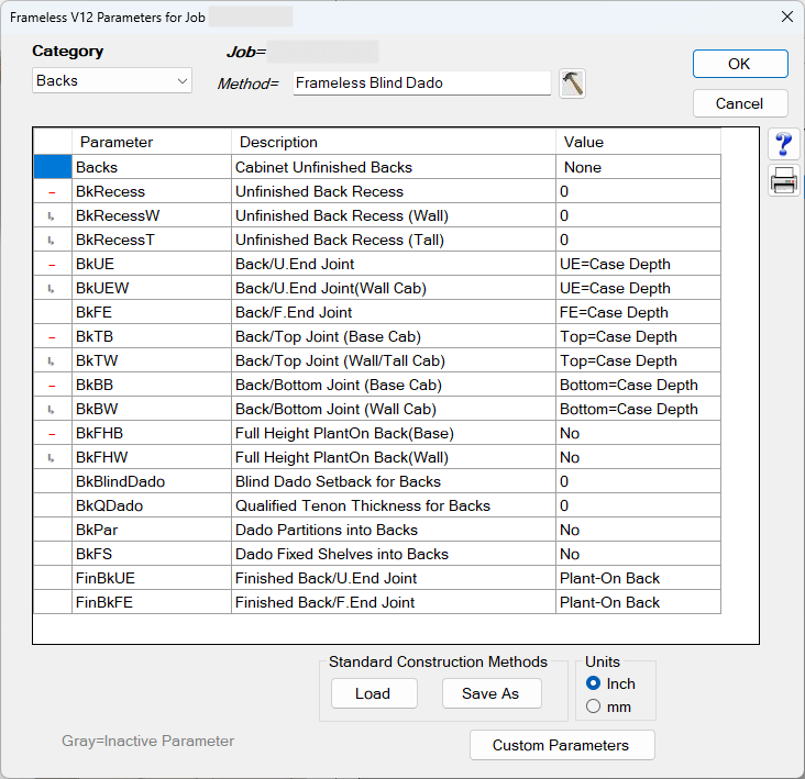Cabinet back parameters control how Mozaik builds the unfinished and finished backs of your cabinets — their placement, recess, joinery to surrounding parts, and dado options. These settings affect your cut list, part sizes, and CNC operations.: